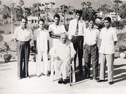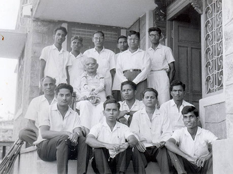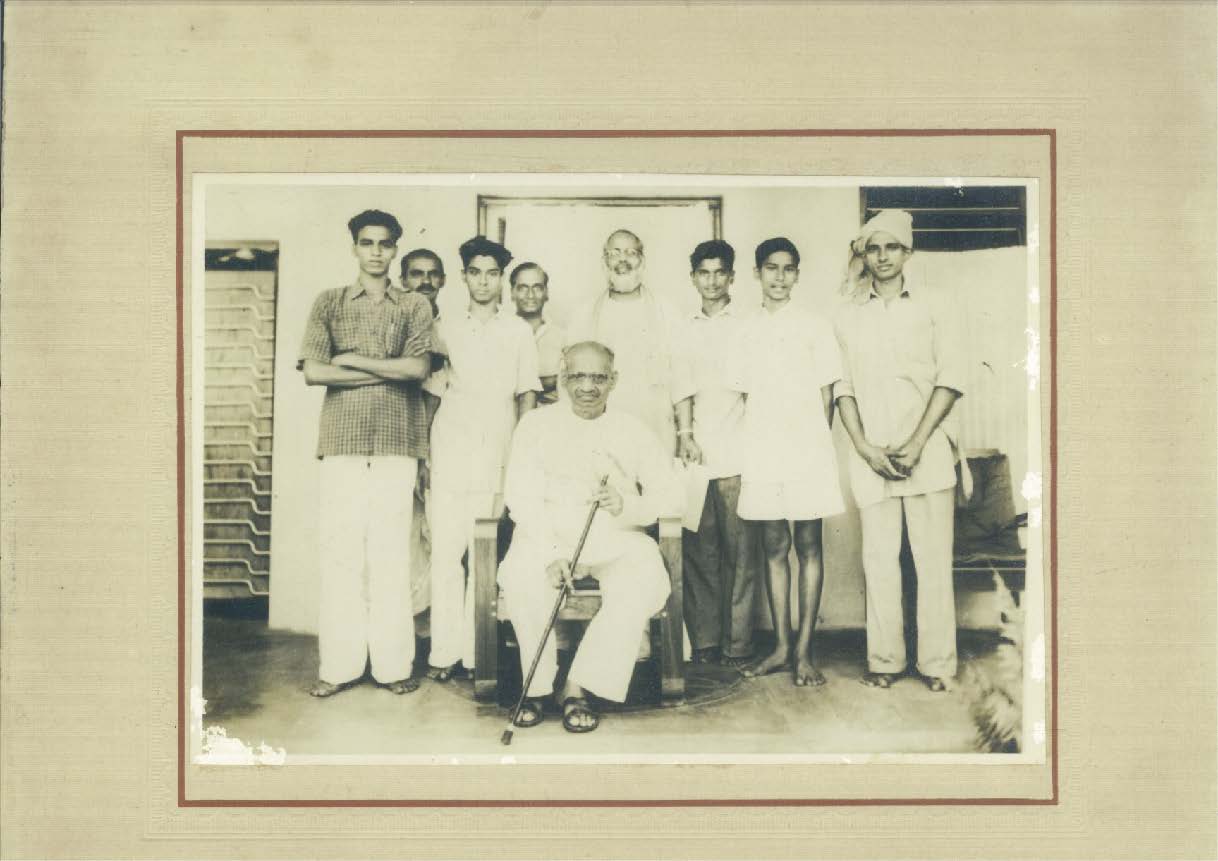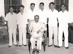 Jnana Vijnana Vihara – (Vijayanagaram House) – Peda waltair Nuclear Physics Department Research staff A. Seshagiri Rao, Parthasaradhi, A. Ramalinga Reddy, Rammohan Rao, Bhupathi Raju Venkatapathi Raju and B. Somalinga Sastry (Standing) with Swamiji. Swamiji was the Professor and Head of the Department (Sitting).