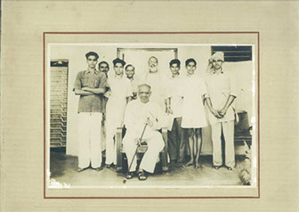 Swamiji sitting on the chair. (Standing): Venkata Rao (cook), Bapiraju from Guntur, Gopalam (servent) Padnabharaju garu (Swamiji's stepbrother), Swami Prajnananada garu,