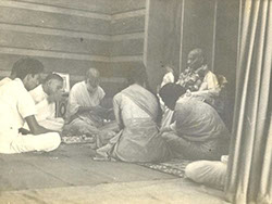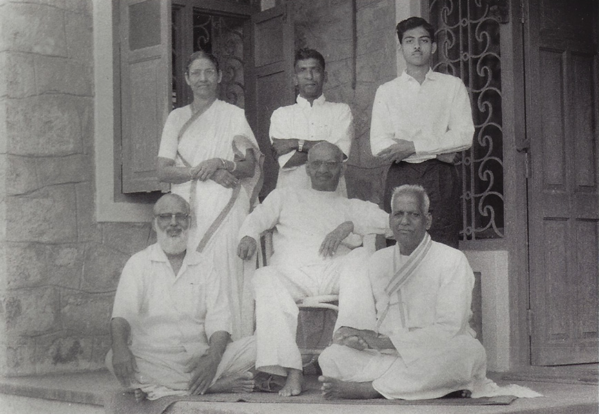 Left to right: Champa ben, Swamiji, Bhogilal Takur (standing), Savita ben, Jyosna ben (daughter of Harshadlal Shodhan).