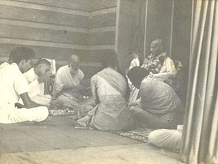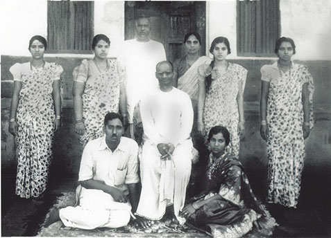 Swamiji (Sitting in center); Standing: Venkata Rao (cook); Sitting on the floor from left: Undi Mudunuri Rama Raju Garu’s daughter Satya Annapurnamma and her daughter Umarani from Penumarru and Kamala from Palakoderu ‐ 1957.