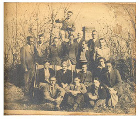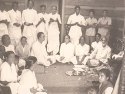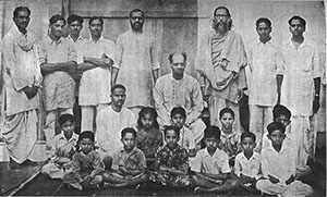 Sitting second row: name unknown, Suryanarayana Raju Garu, Leela, Swarajyam, name unknown and Rajyam; Standing: Nadimpalli Gopala Raju Garu, name unknown, Venkataramudu, Padmanabha Raju Garu, Swami Prajnanananda, Swami Pranavananda, name unknown and Krishnam Raju Garu.
