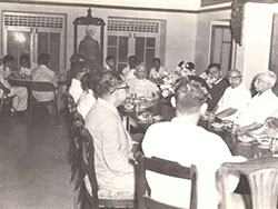 Swamiji Birthday Party – Swamiji sitting in the chair at the table. Others in the picture: Swami Prajnananda garu, Nadimpalli Thirupathi Raju, Datla Suryanarayana Raju Garu, Sita Ram (servent), Ramarao, Satyanarayana Raju and other Nuclear Physics department staff.