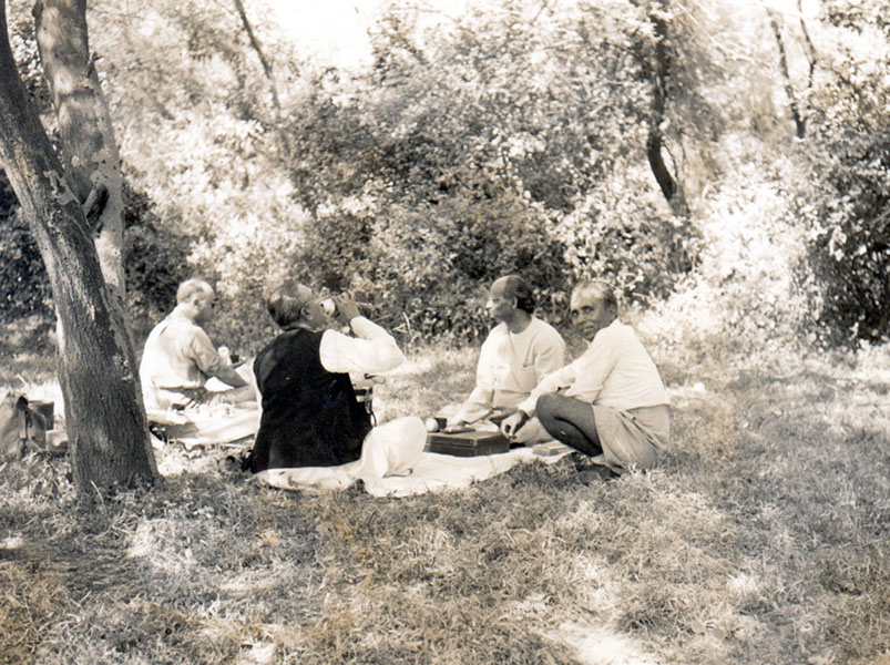 Nuclear Physics Department Picnic. Swamiji (Sitting on a chair at the table in the back) with faculty and students at lunch. Bhimili – 1962.