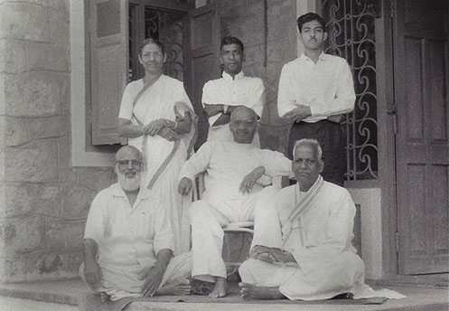 Swami sitting on a chair in the center; Sitting on the floor front row: Santha Devi; Krishna Varma Ammaji, Rambabu, Jayababu and Rama Raju.