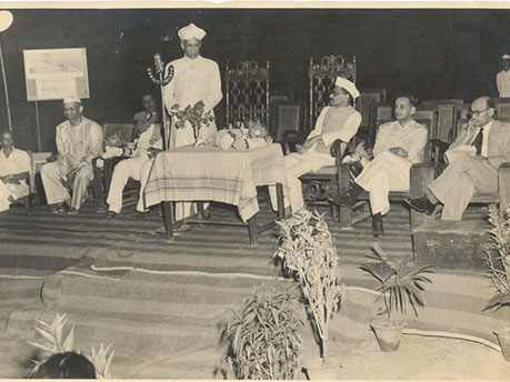 Maharaja Football Ground, M R College – Vijayanagaram: Swamiji at the Independence day celebration: Vasantharao Venkata Rao, Principal speaking. – 1962.