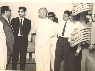 Dr. Homi J. Bhabha, Dr. V. Lakshmi Narayana and Swamiji at the Nuclear Physics Department.