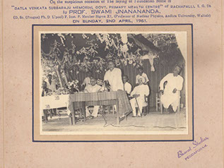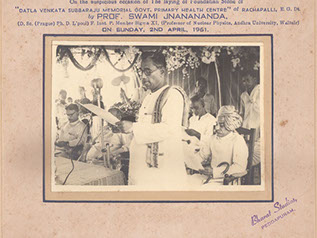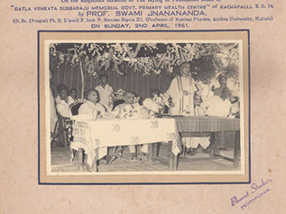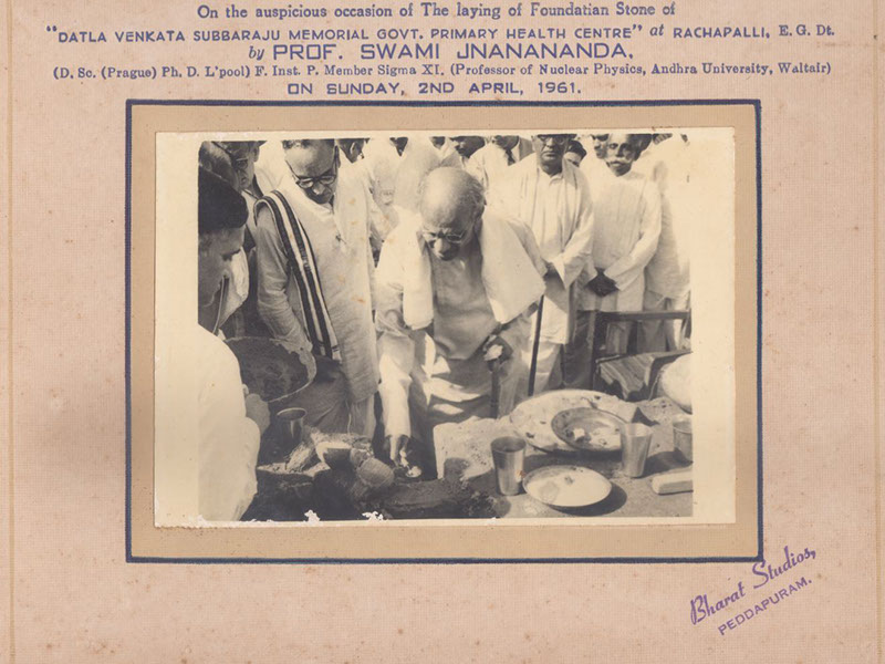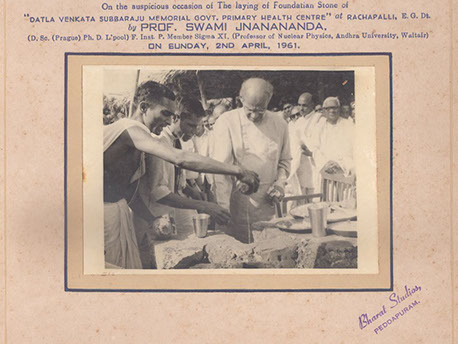 Swamiji laying the cornerstone for the Primary Health Center with Brothers of Datla Suryanarayana Raju, Rachapalli, East Godavari Dt. (A.P). – 1961.